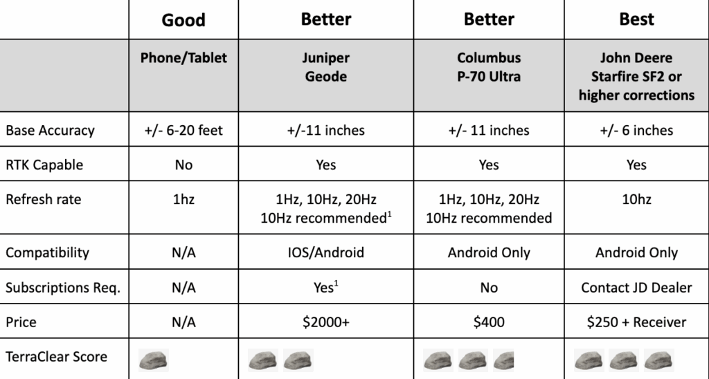 TerraClear Rock Maps use precision RTK to detect and mark rocks 8″ and larger, however your device’s GPS source determines how easily you can locate them in the field. After testing multiple options, we know the right GPS makes the difference between frustration and efficiency.